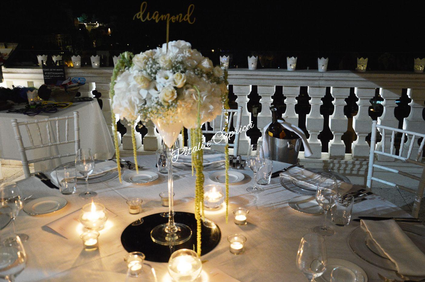 Centrotavola coppa martini di rose e ortensia nella terrazza del nh in taormina